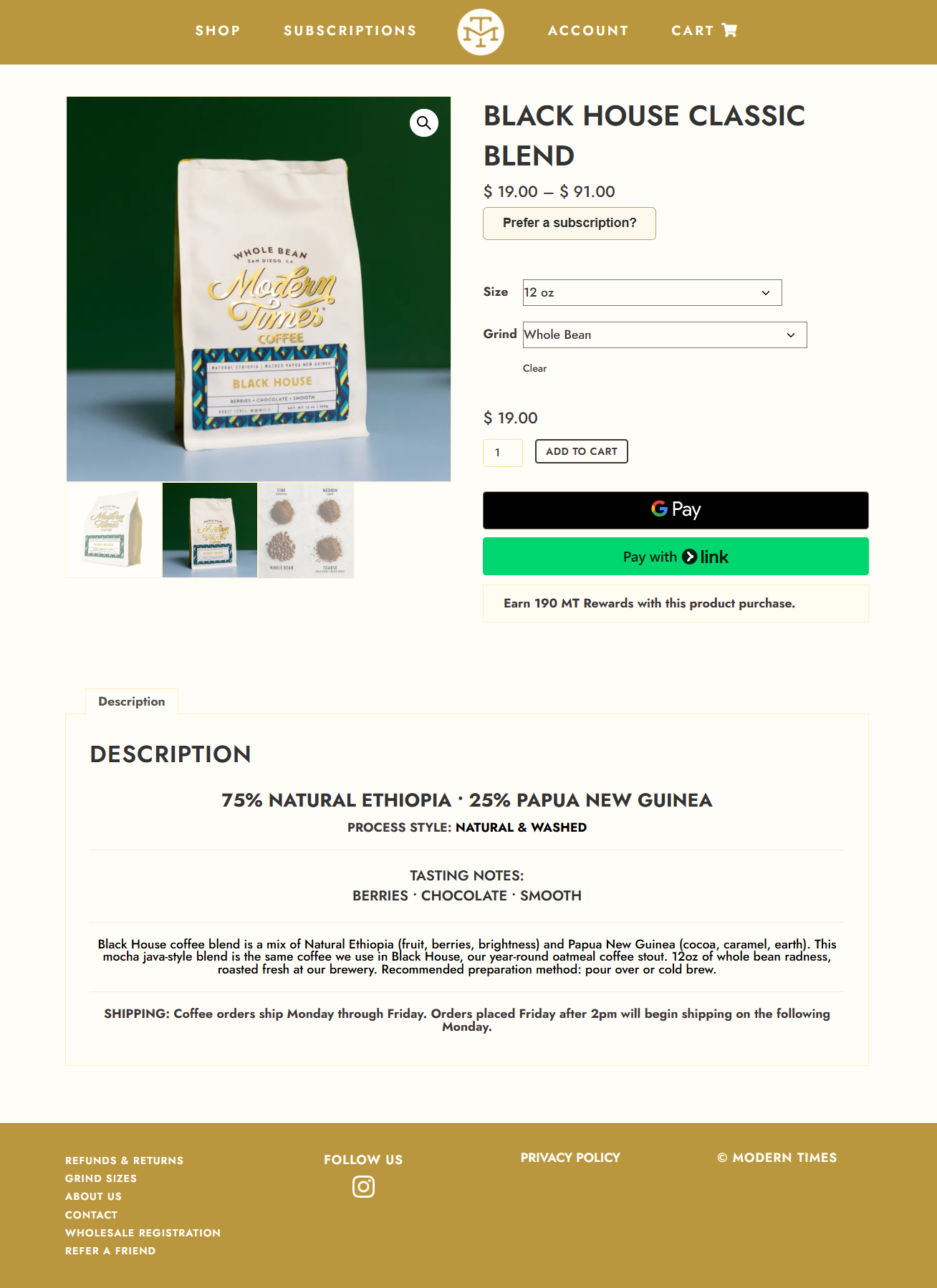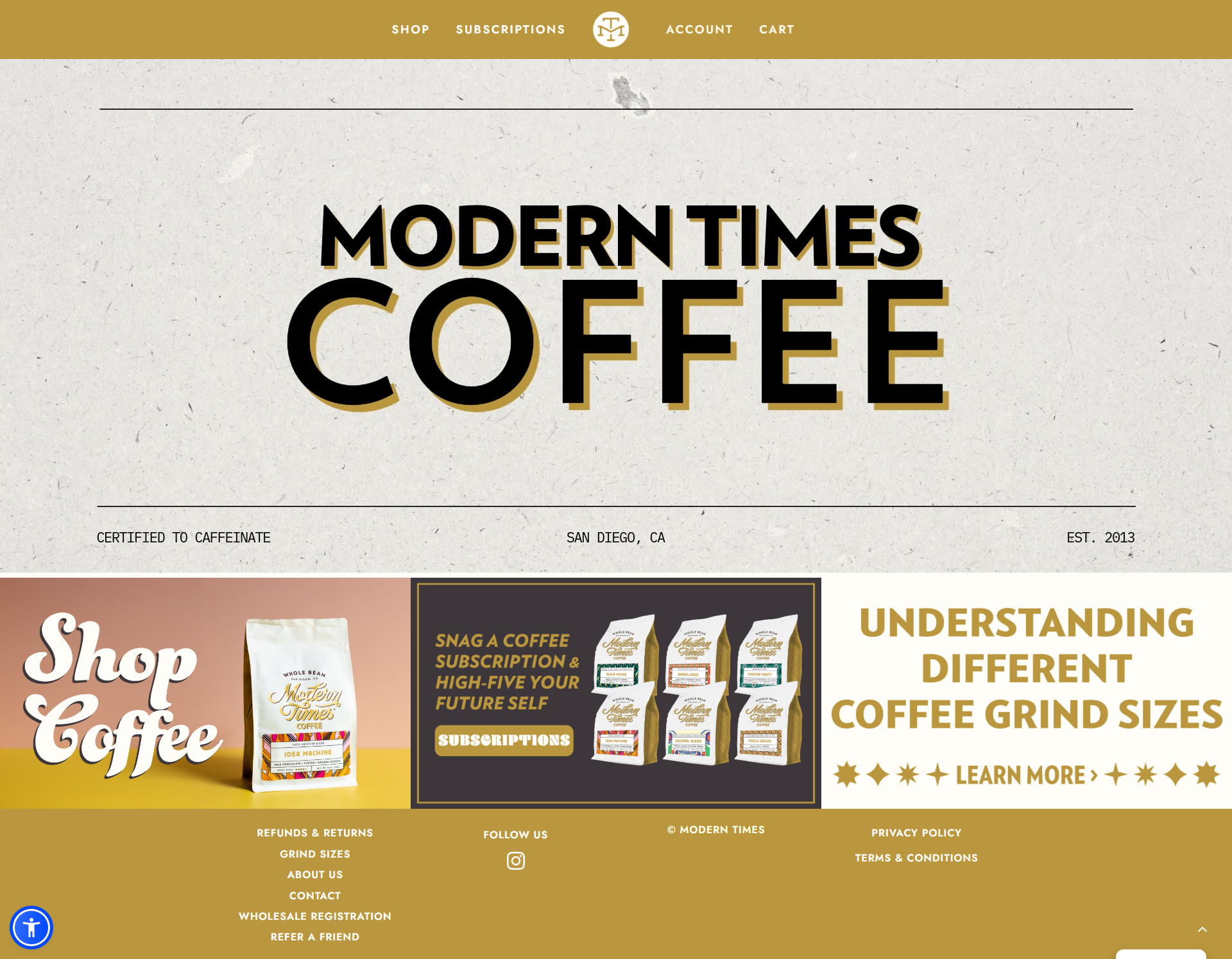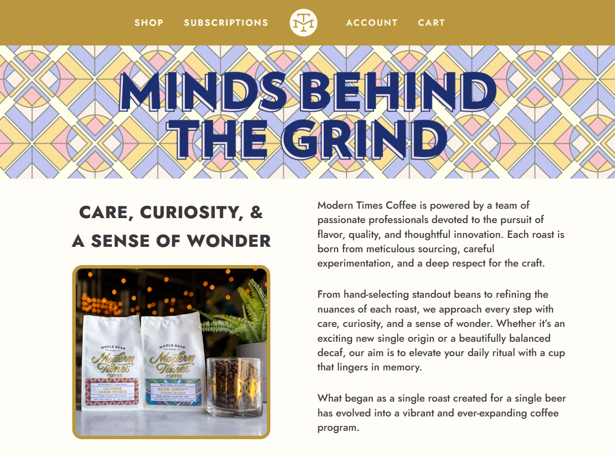 ModernTimes.coffee was created as a fully custom e-commerce platform for the coffee side of the business. Built on WordPress with WooCommerce, I handled everything from page structure to visual design and styling. Custom HTML and CSS were used to enhance the shopping experience, optimize layout, and bring clarity to product categories, subscriptions, and checkout flow. The site reflects a clean, editorial approach while supporting the needs of both retail and wholesale customers.  Visit Site >