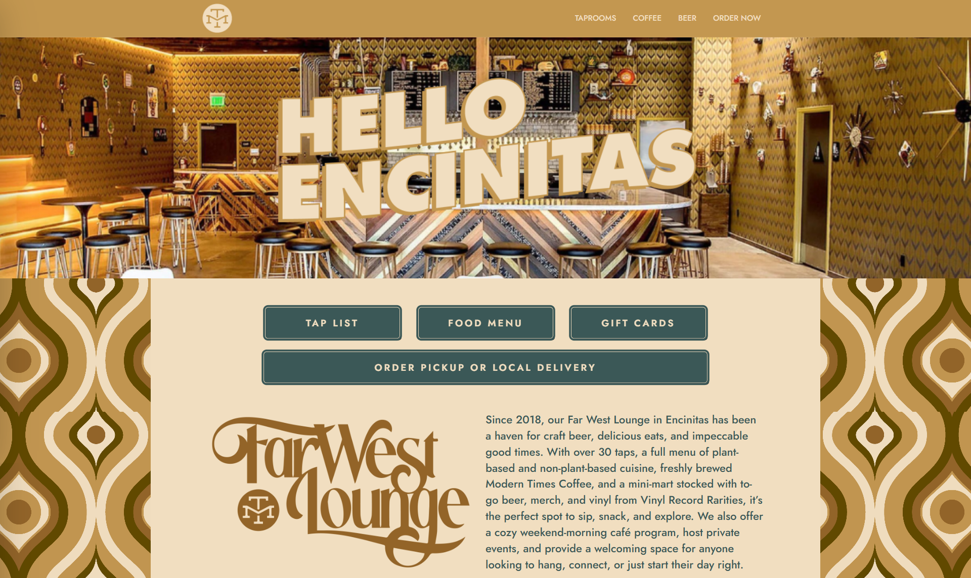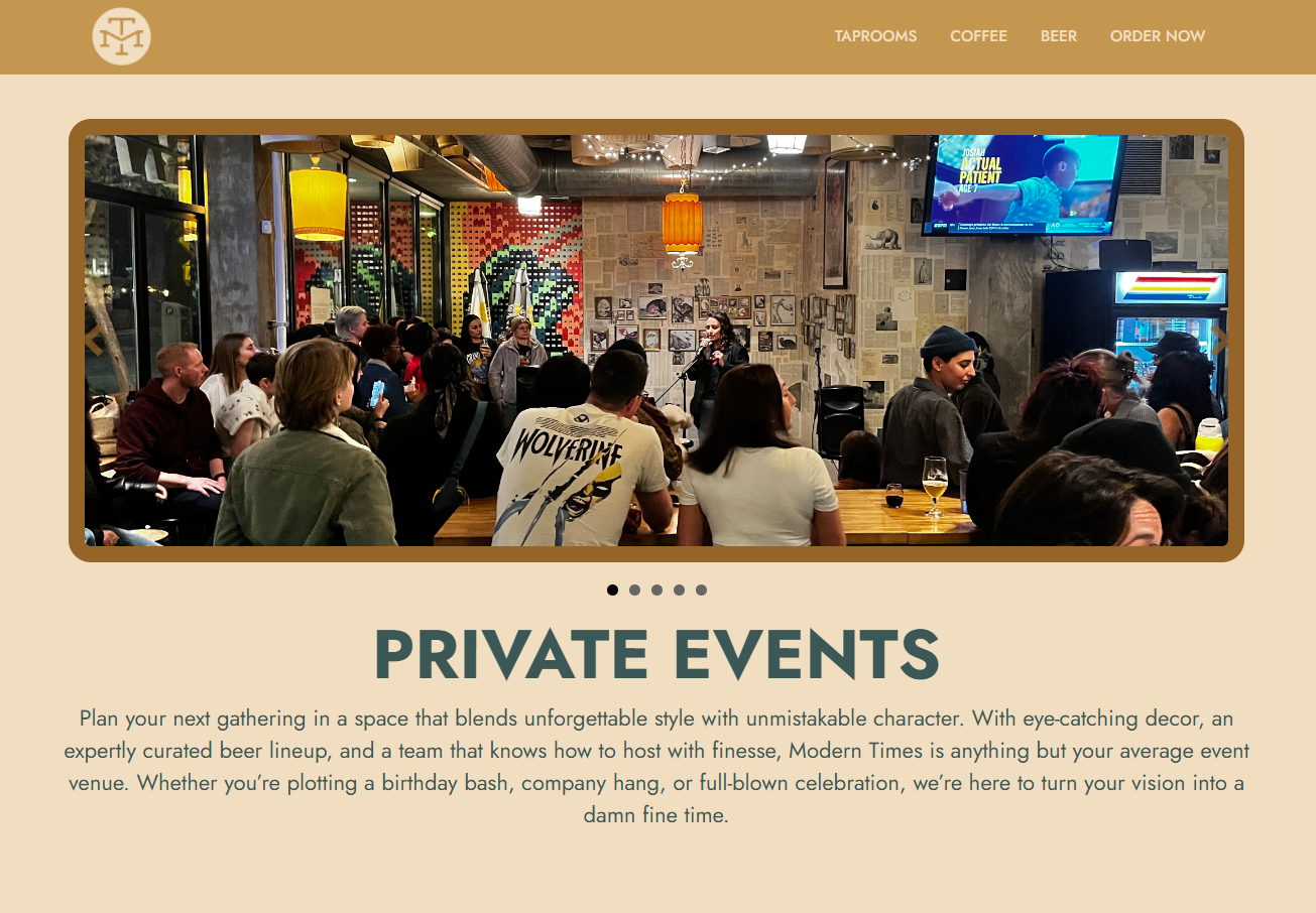 This site was built to separate the taprooms from the existing Modern Times Beer website, which is controlled by the parent beer brand now. Designed and developed on WordPress using Beaver Builder, I structured the site to focus on hospitality—featuring taproom details, private event bookings, and ongoing promotions. It can even link visitors to Toast to place online orders, all from one website. I implemented custom HTML and CSS to fine-tune layout, branding elements, and user interaction. The result is a flexible, mobile-friendly site that feels cohesive, easy to update, and aligned with the brand’s irreverent tone. Visit Site >
