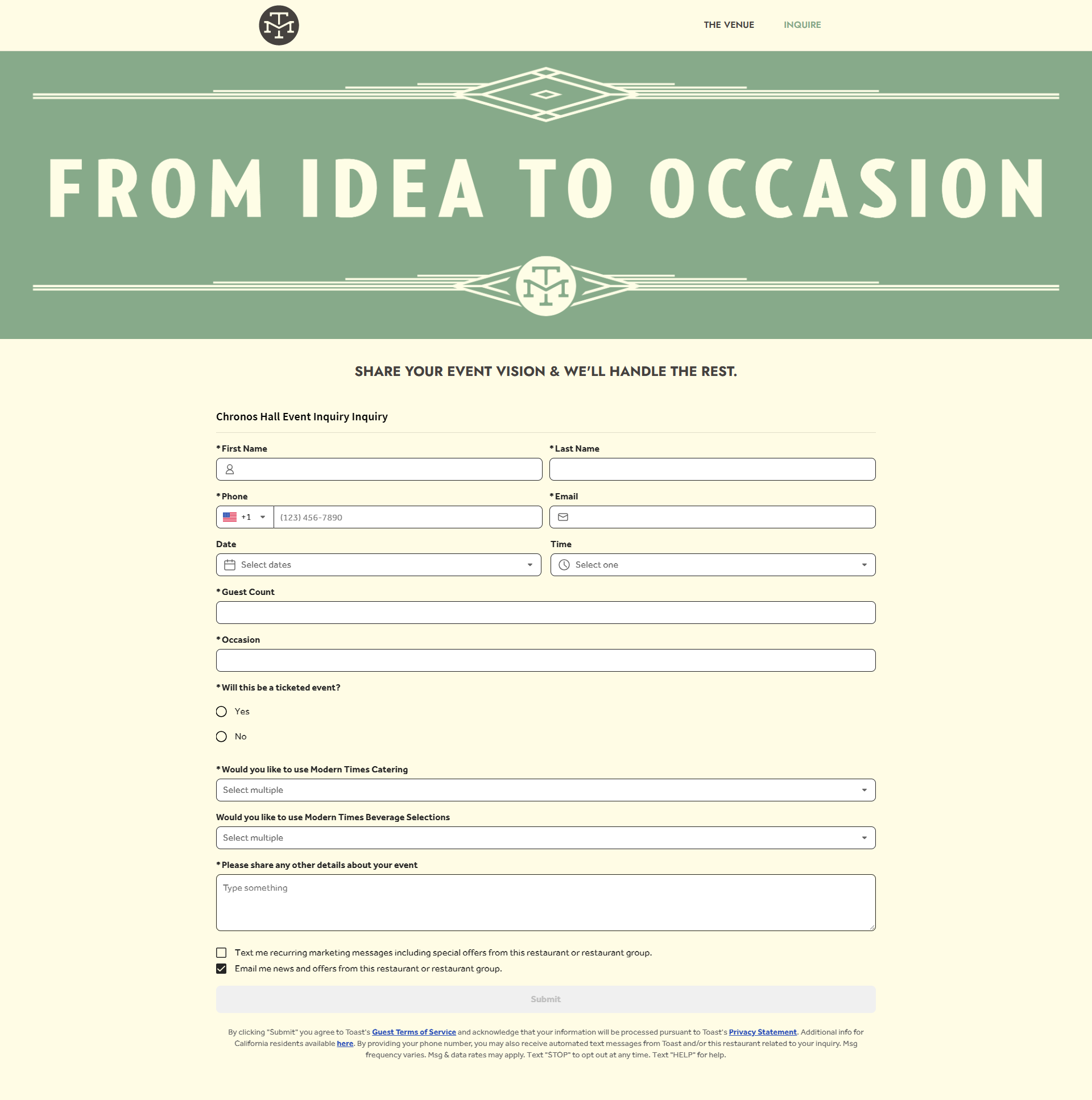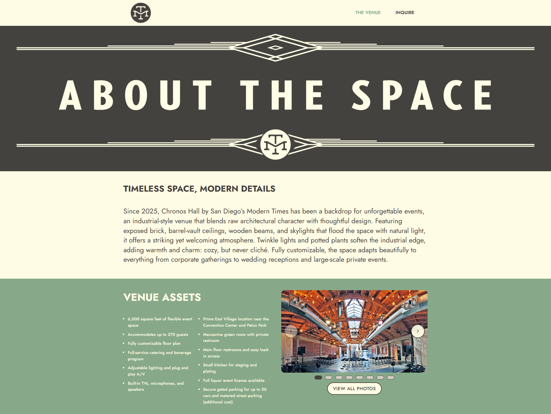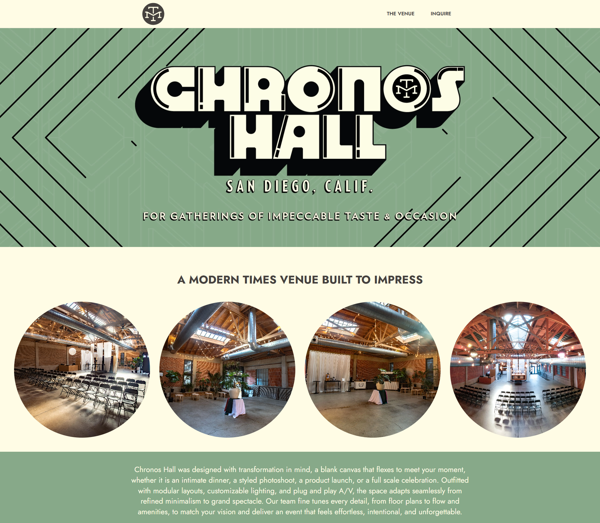 ChronosHall.com was created as a dedicated home for Modern Times’ largest private event venue—separate from the main taproom and coffee sites. Built on WordPress with Beaver Builder, the design emphasizes elegance and flexibility, showcasing event capabilities, photo galleries, and booking options. Custom HTML and CSS were used to refine the layout and preserve Modern Times’ signature aesthetic while giving Chronos Hall its own refined identity. The result is a polished, responsive site that highlights the space’s versatility and makes private event inquiries effortless. Visit Site >